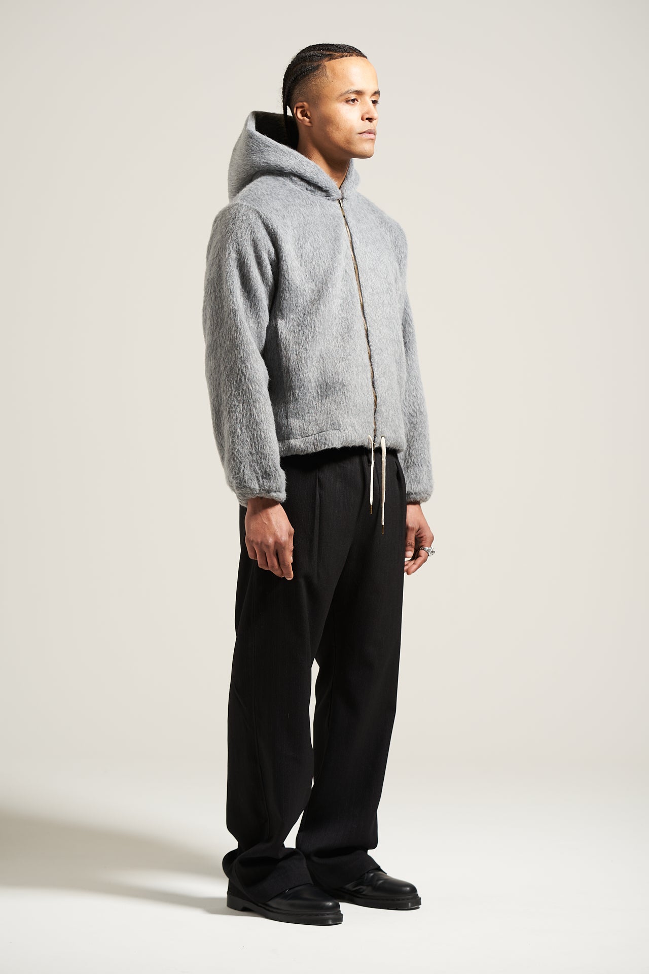 New for AW25/26 we introduce the cinch hoodie in a brand new silhouette to our legacy line-up. Cut from wool heavy coating. Features a boxy fit, cinchable waist, double lined hood and elastic cuff, antique brass hardware with our classic label detailing. Lined with a beautiful cotton line blend.