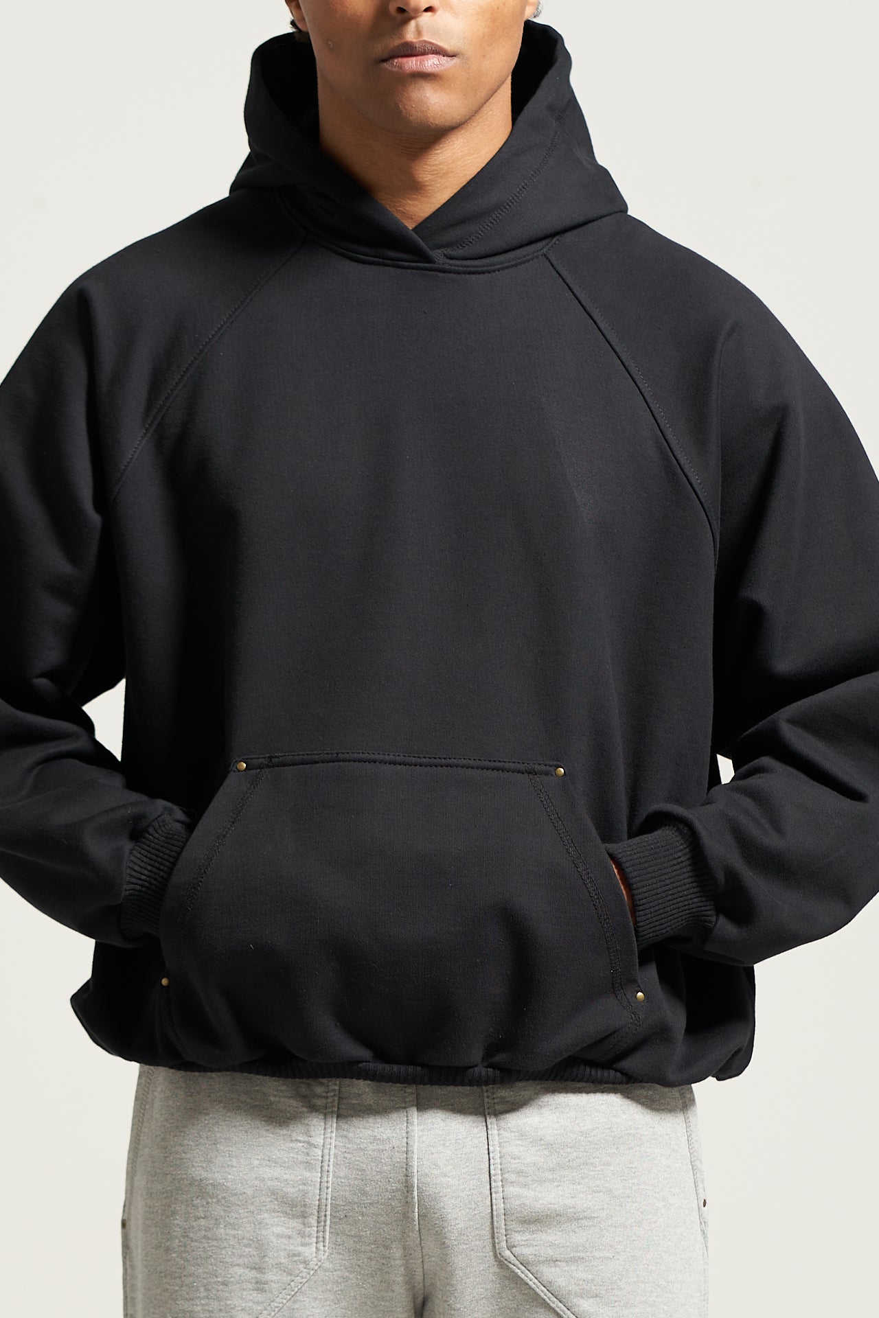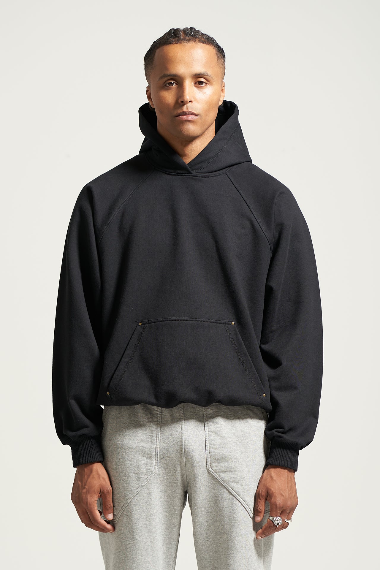 Features a boxy fit, raglan sleeve, double faced hood, riveted front kangaroo pocket, floating yoke with rib cuffs and waistband, and our classic label detailing.