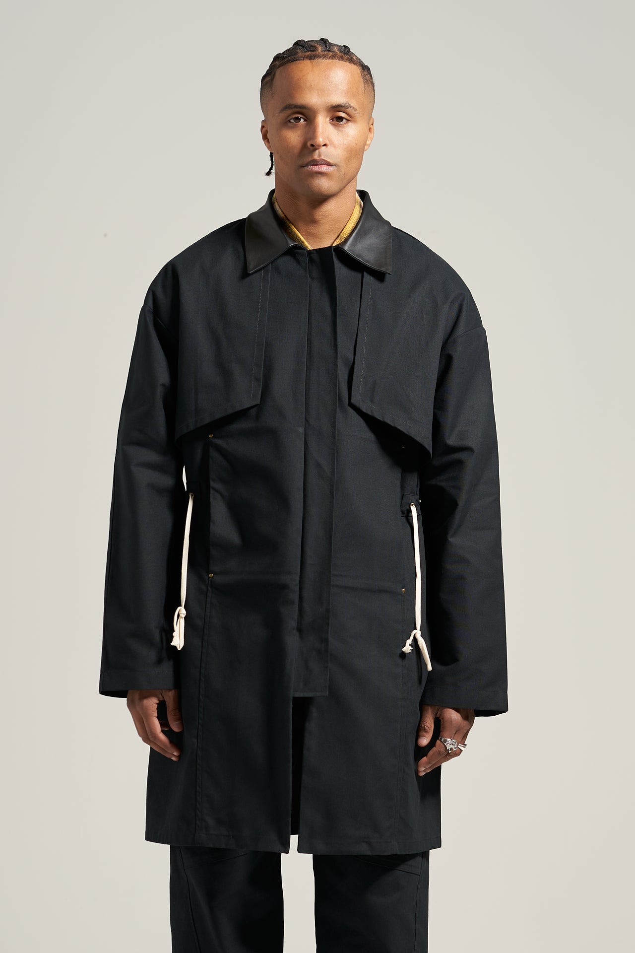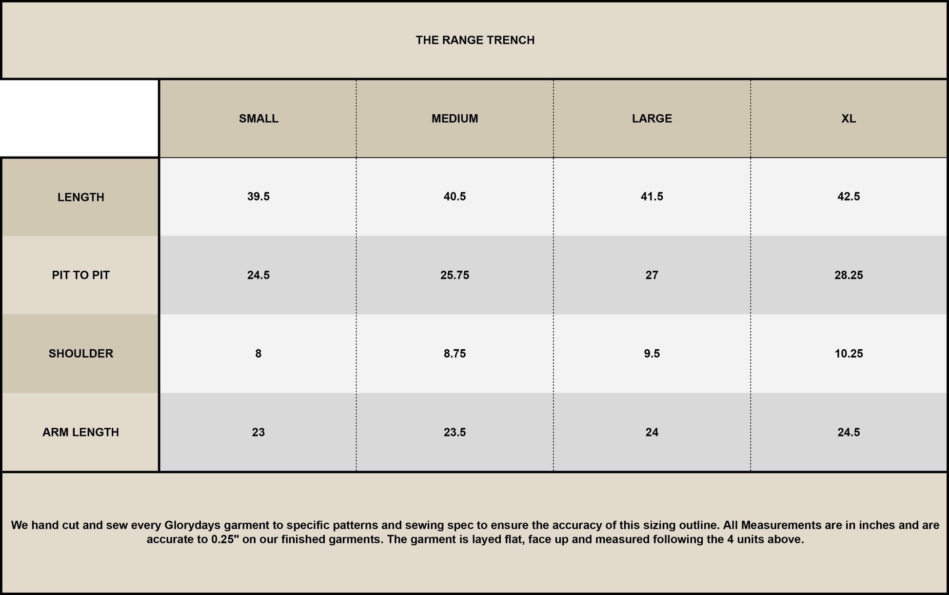 New for AW25 we introduce the range trench, our most beautiful over coat to date. Cut from a 11oz brushed cotton canvas. Features a knee length wide fit, front and back storm flaps, 2 riveted inseam pockets, cinchable waist with contrast drawstring and waxed full grain leather collar.