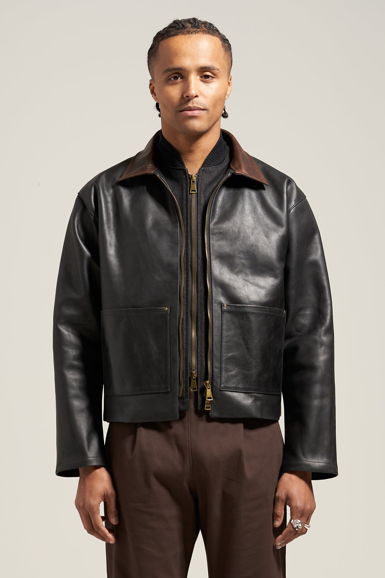 New for 2025, we introduce the Bolans Jacket, inspired by the location of our AW25 campaign. Cut from a supple heavyweight full grain waxy cowhide leather. Features a boxy cut, 2 way heavy brass zipper, viscose paisley lining, 2 panel pockets and a contrast brown full grain cowhide collar.