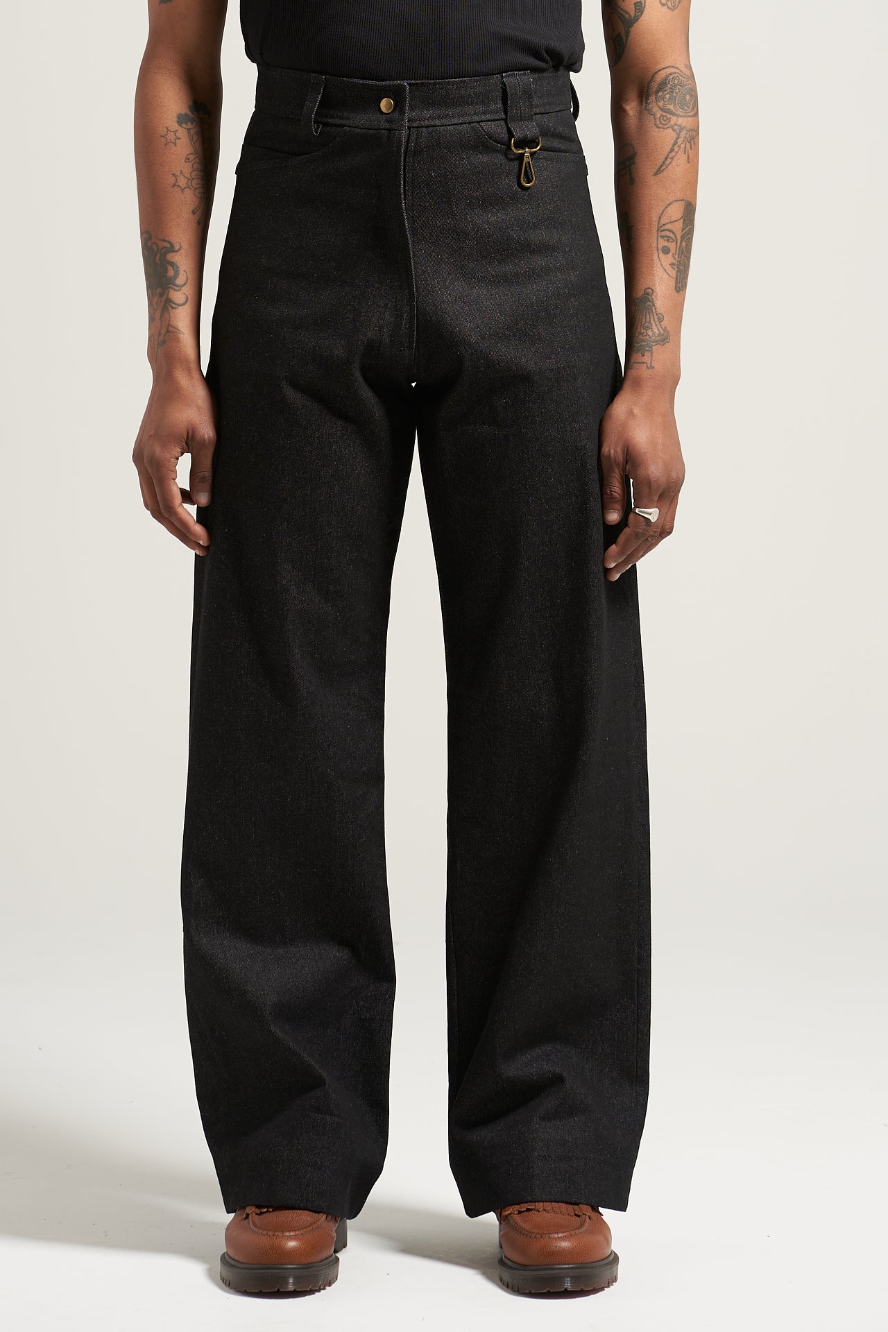 And last but not least, the 001 denim: Cut from a 14oz cotton denim twill. Features a straight leg, high waisted fit, YKK zip fly with snap button waist closure, wide hem to fall on the shoe perfect and 5 pockets throughout and our veg tan leather tag. Our take on the classic 5 pocket denim.
