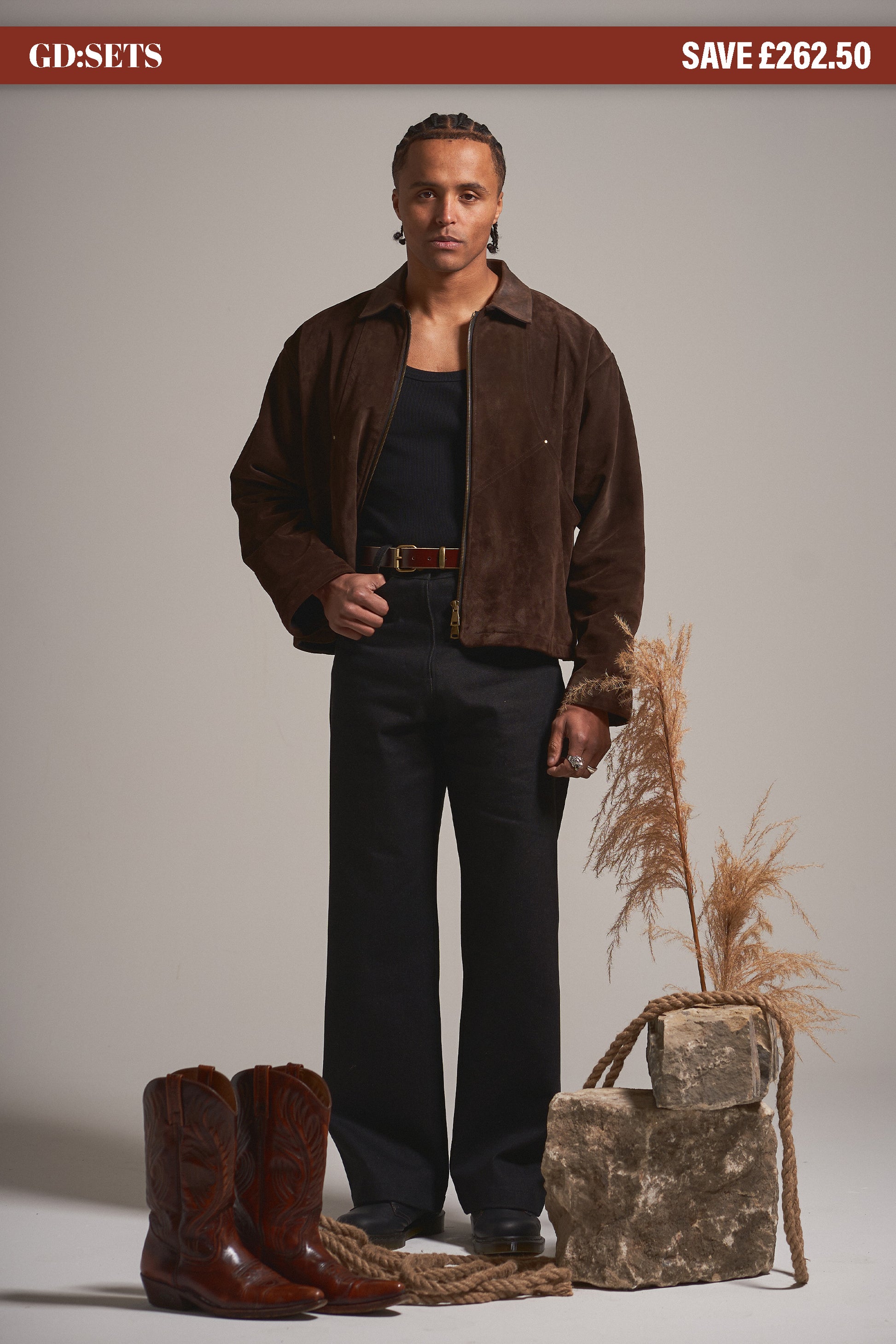 Includes the umber suede flight jacket, oxblood forever belt and the raw black 001 denim with a grand saving of £262.50 over buying the pieces separately.