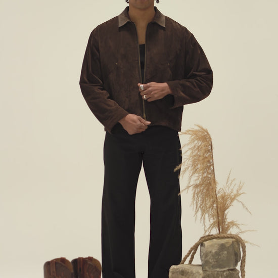 The Suede Flight Jacket features a full grain calf suede construction, boxy fit, 2 bucket pockets, western back yoke, custom antique brass hardware and our classic back label detailing.