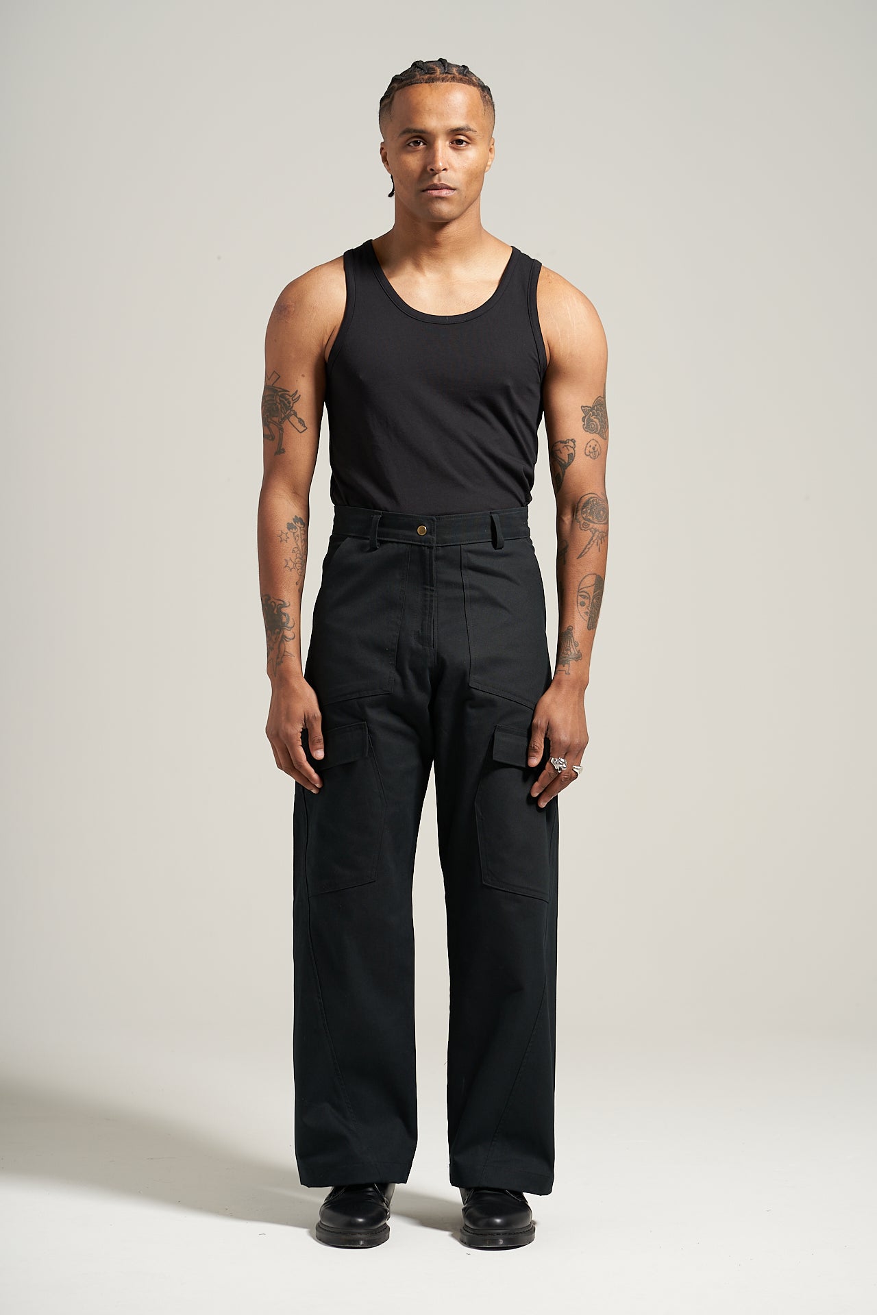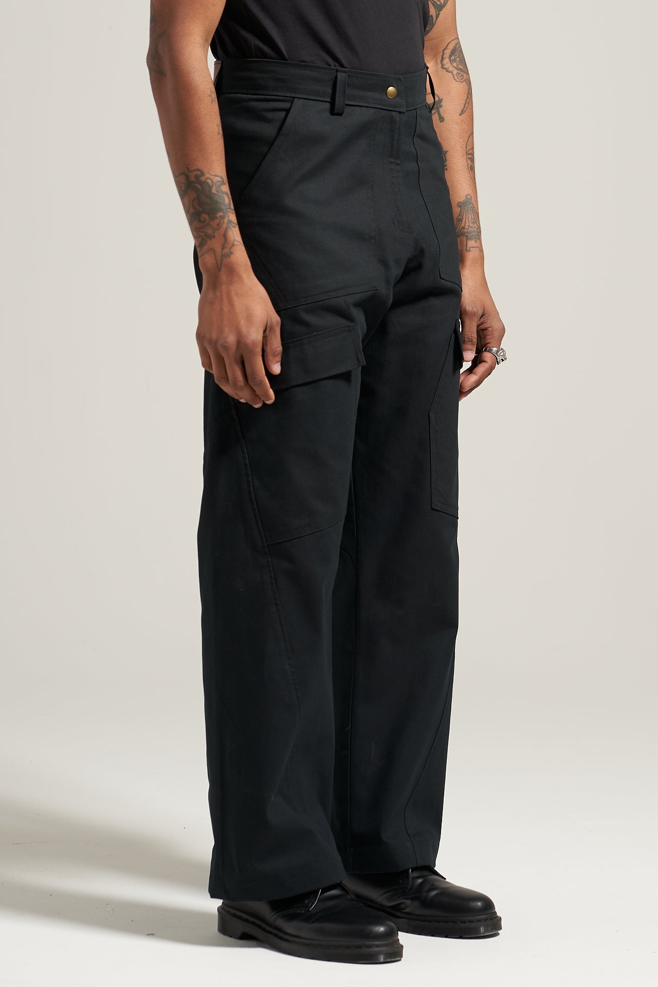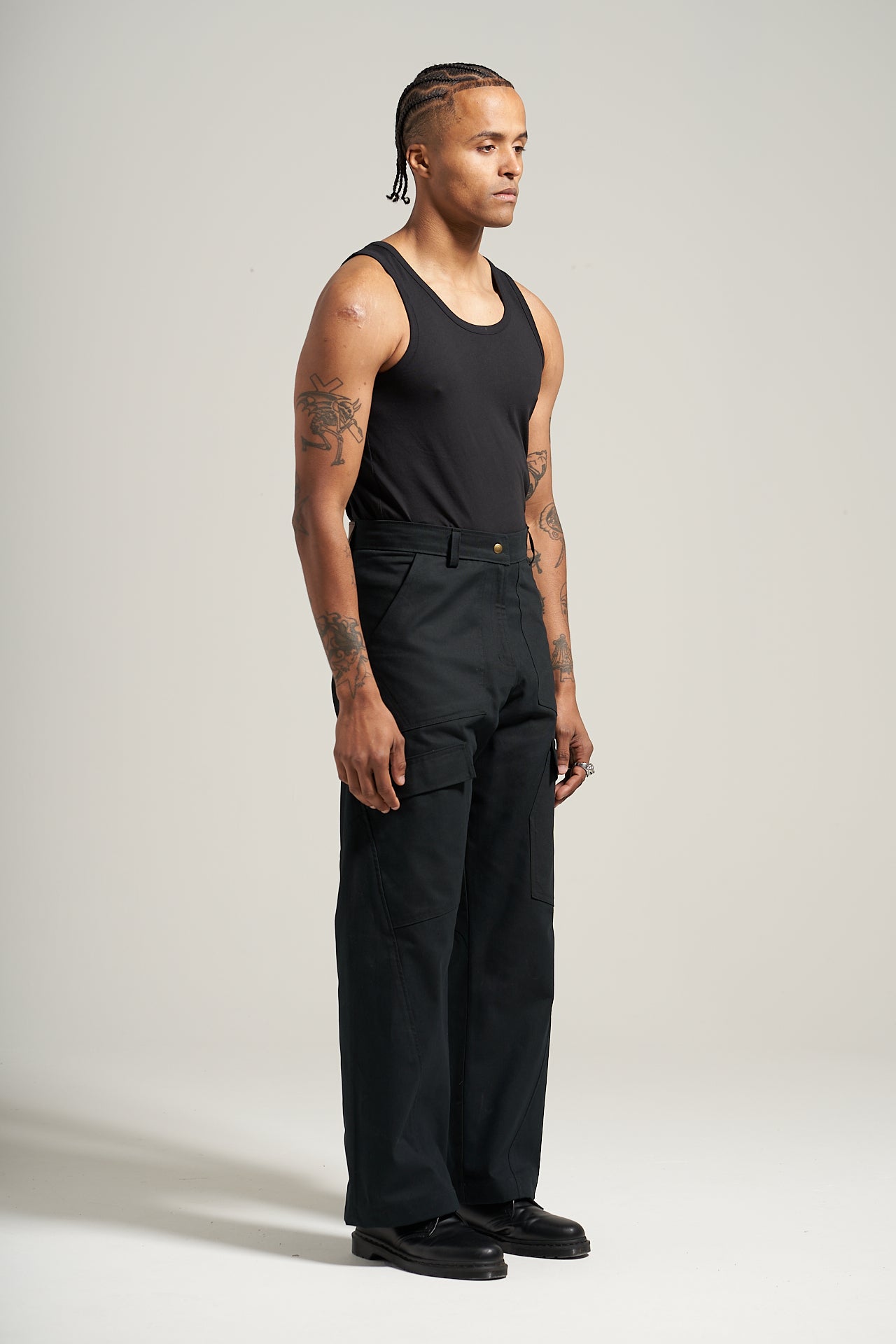New for 2025, we introduce the Geo-cargo. Cut from a 100% cotton peached canvas. Features a straight leg, wrap around seam detailing, ykk zip fly with brass button waist closure, 6 pockets throughout and our veg tan leather back patch detailing.