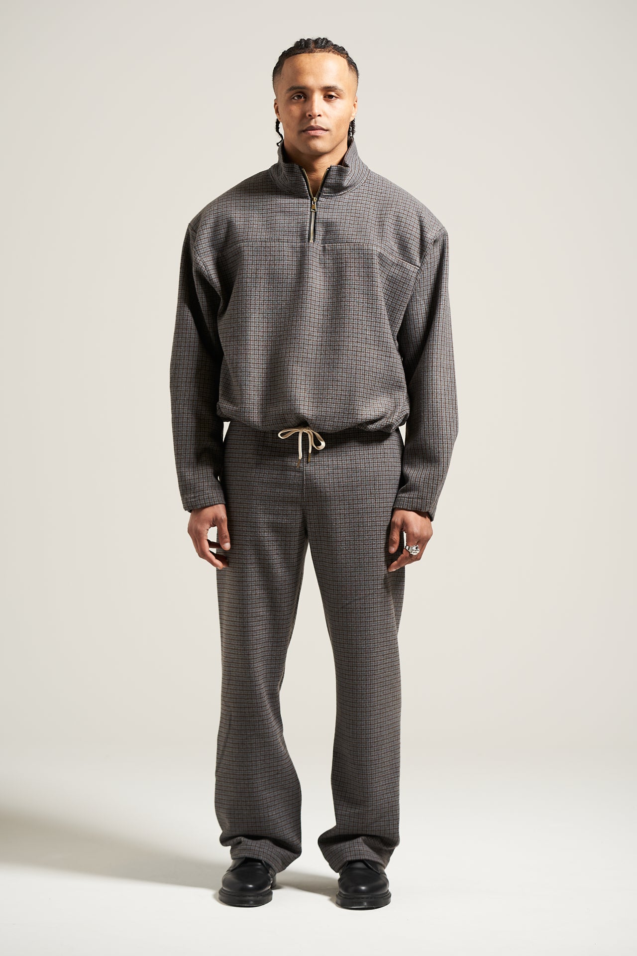 New for AW25/26 we introduce the quarter zip in a brand new silhouette. Cut from ultra soft wool blend fabric. Features a boxy fit, cinchable waist, antique brass quarter zip and button cuff cuff, with our classic label detailing.