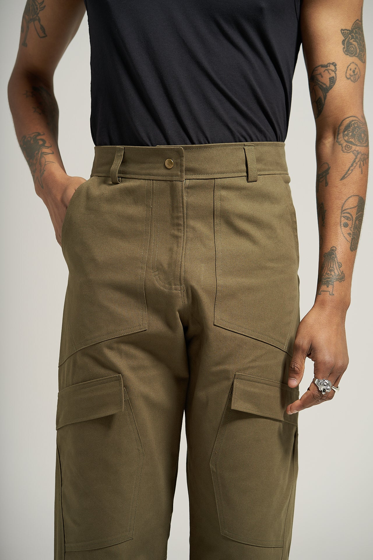 New for 2025, we introduce the Geo-cargo. Cut from a 100% cotton peached canvas. Features a straight leg, wrap around seam detailing, ykk zip fly with brass button waist closure, 6 pockets throughout and our veg tan leather back patch detailing.