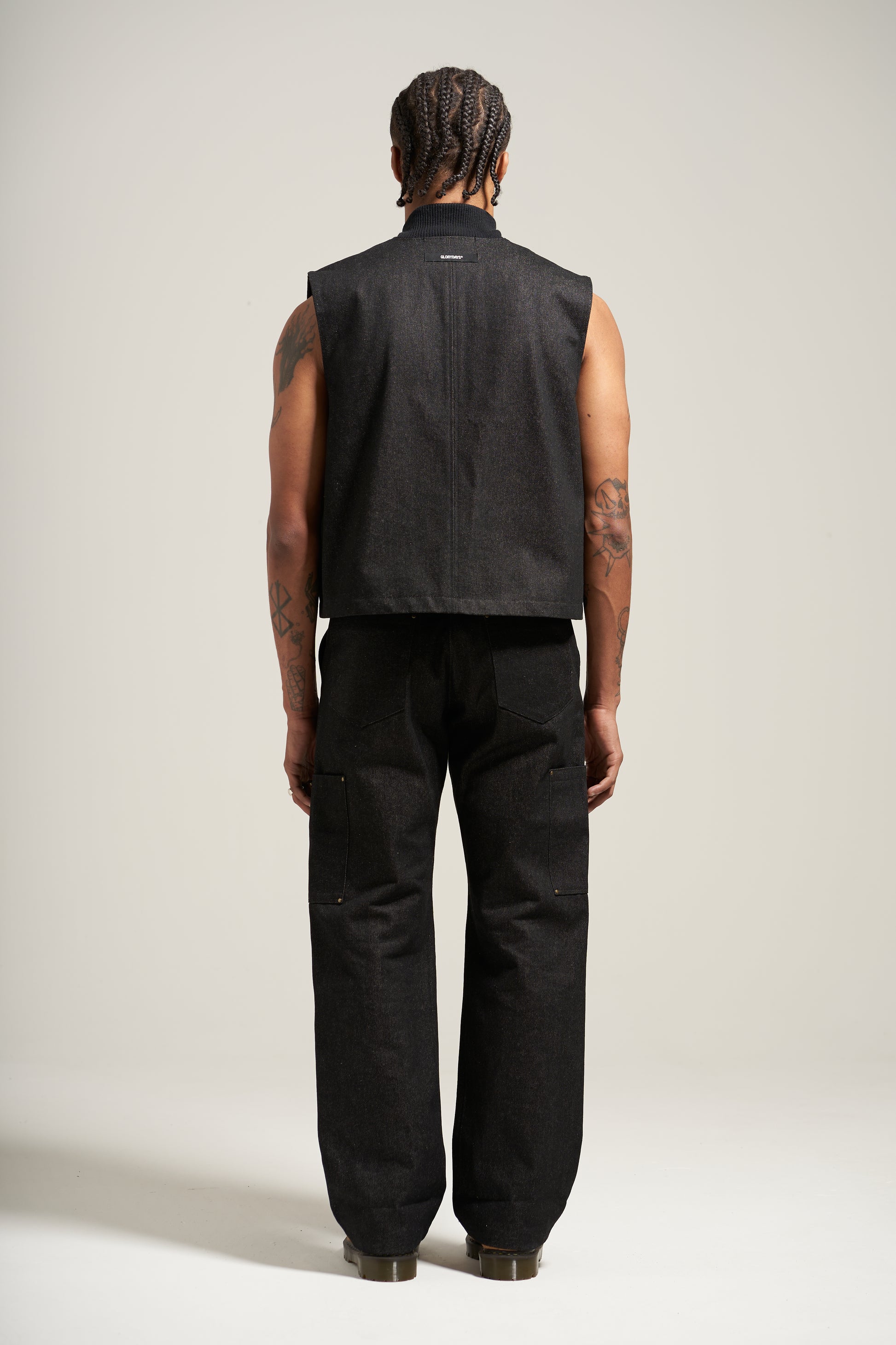 Reinvented for AW25, We reintroduce the carpenter vest in its classic silhouette. Cut from a 14oz heavy raw denim. Features a Boxy fit, 3 large asymmetric pockets, heavy brass hardware and our classic label detailing.