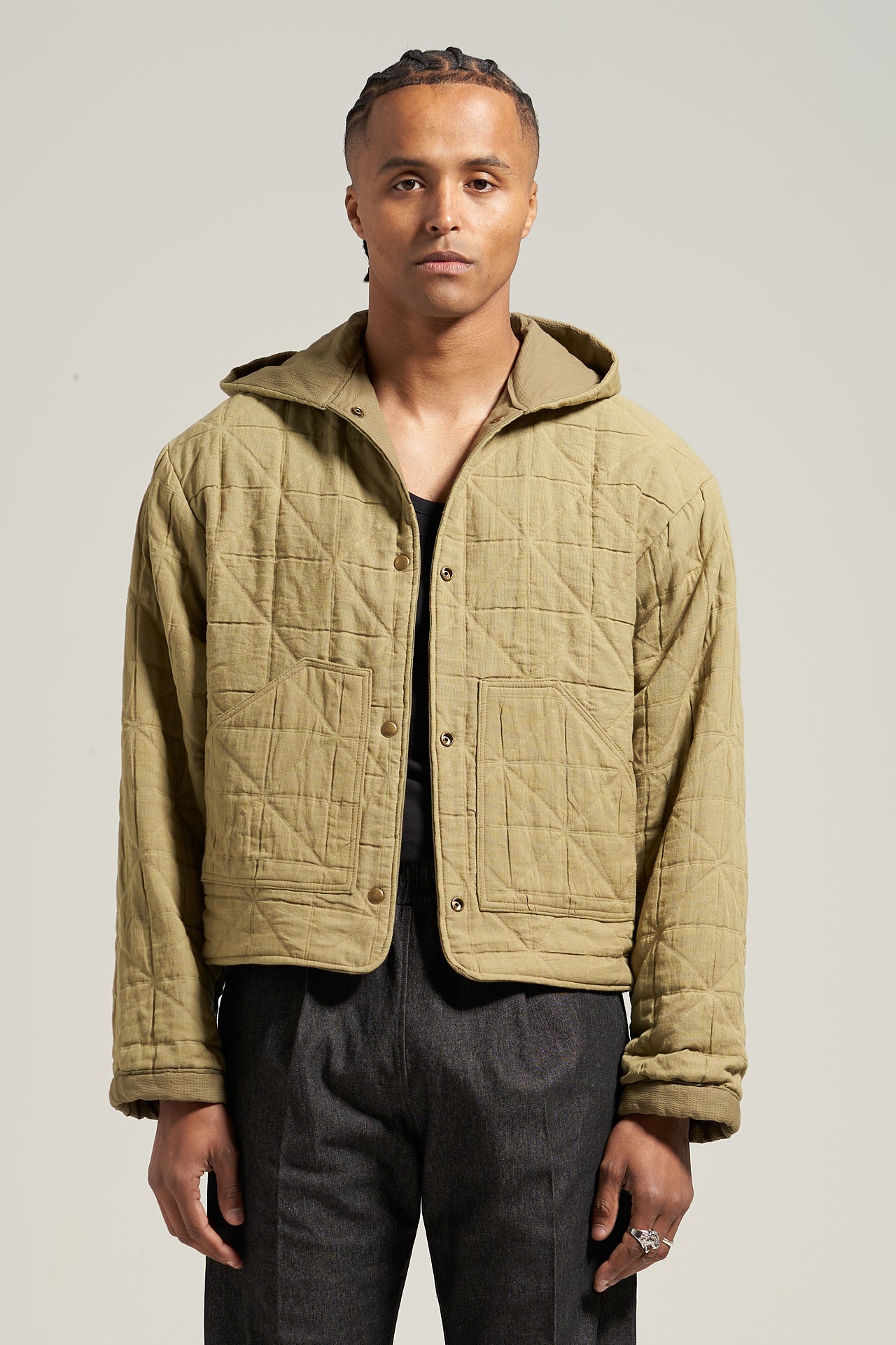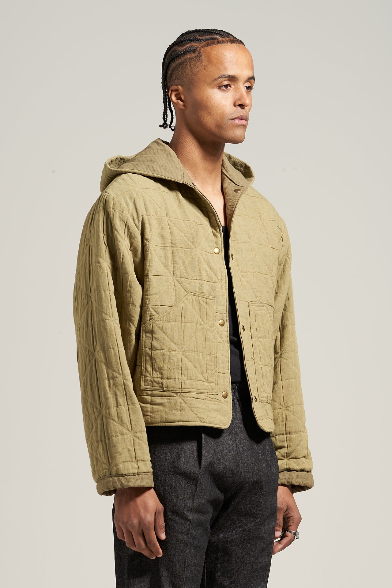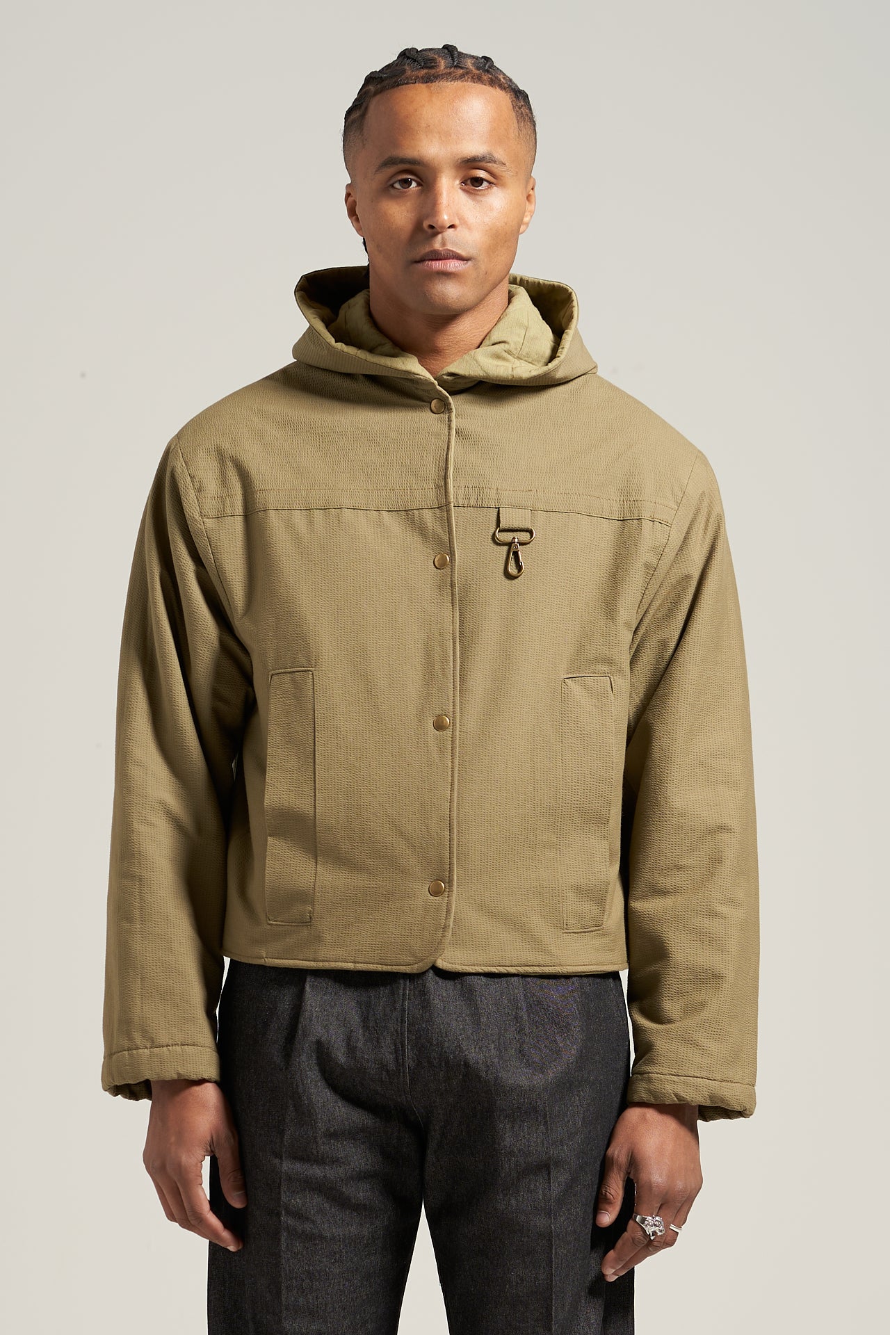 New for AW25 we introduce the Reversible field jacket, a new workwear staple to the GD lineup. Cut from a light weight seersucker on one side and quilted washed jacquard on the other. Features a boxy fit, snap closure, 2 front pockets on both sides, double lined hood with our classic label detailing.