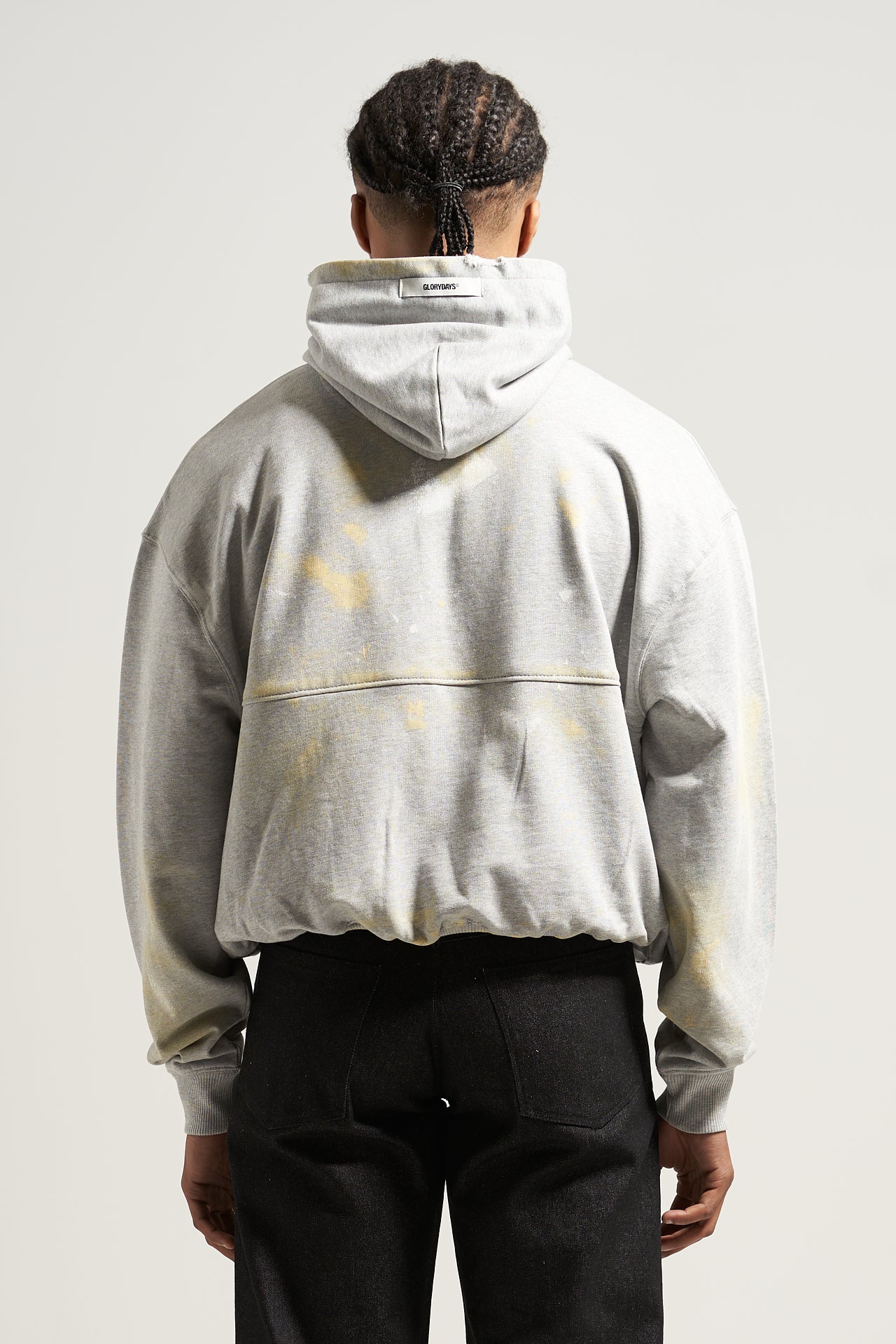 New for SS25, We introduce the Studio hoodie. Cut from a 400gsm 100% cotton French terry jersey. Features a Boxy cropped fit, roomy hood, print, paint and distressing details and our classic label detailing.